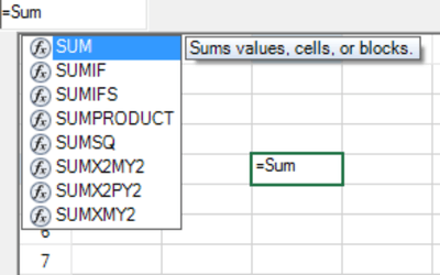 The formula text box can be connected to a Spread instance. This is similar to the formula editor that’s available to the developer, but has the appearance of a text box and is available at runtime. It provides a list of calculation functions in addition to a visual method of selecting cell ranges for the formula. It can be used by creating a FormulaTextBox class and attaching it to the Spread instance at design time. In addition, the formula text box allows using intersection and mixed reference formula, as well as table formula with structured references.