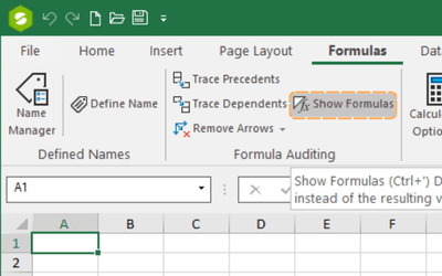 Spread allows you to display and highlight the formula in a cell instead of its final calculated value. This can be done using the DisplayFormula property on the worksheet to enable or disable the display and highlight of cell formulas. When that property is set to true, cell formulas are highlighted, and the column widths are also doubled to display long formulas. If the property is set to false, the column widths will be restored to the original width. This functionality can also be enabled with the Spread Designer by using the Show Formulas button in the Formula Auditing section.