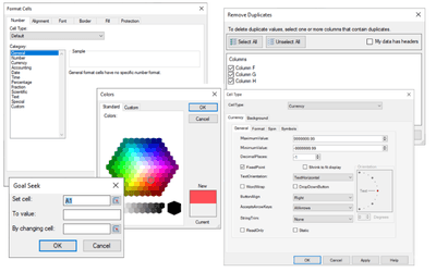 The Spread Designer provides a number of built-in dialogs that enable users to add data tables, format cells, insert functions, create forecast sheets, remove duplicates, add fill effects, etc. While these dialogs are available in the Spread Designer, they can be invoked at runtime by using the BuiltInDialogs class. Each of these dialogs control different properties of the Spread instance and the sheets in addition to creating different types of sheets.