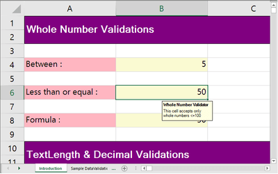 The content of cells in Spread can be validated in a number of ways with Data Validation. Data within cells can be validated using built-in validators , including cell comparison, character format, string comparison, value comparison, encoding, etc. Cell content can also be validated using Cell Type Validation, which will verify that that the content fits the requirements of the cell type’s format and settings. This data will be checked when it is entered by the user or through code, when the component loses focus, or both. The error messages for the input validation can also be customized. In addition, error icons can be displayed in cells or rows to indicate invalid data in the sheet.
