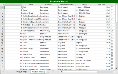 You can bind the Spread component to an external data set, such as data in a database. You can easily customize how data is bound and include features like hierarchical display. Data can be bound to entire sheets, columns, cell ranges, or combo boxes. Binding the data can be done in either the Properties window of the Spread Designer or using code.