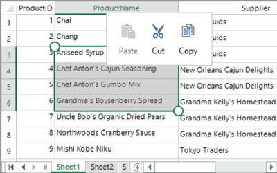 The Spread component supports touch gestures, which can be used in all sorts of interaction, and this is supported through a touch screen. Touch messages are displayed in cell areas when tapping, panning, pinching, etc. on cells. These same touch interactions are treated as mouse messages when performing them on header or scroll areas. A touch keyboard can also be displayed when editing a cell using touch gestures. By default, a touch menu bar will appear when tapping a selected range to cut, copy, and paste cells. This menu can also be customized by adding or removing items.