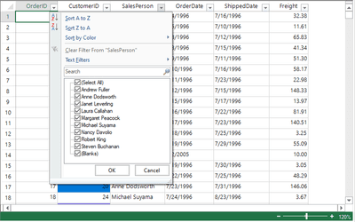 Sorting in Spread can be done in various ways, one of which is automatic sorting. This can be accomplished by letting the user automatically sort rows by clicking on a column header. Rows and columns can also be automatically sorted via code. In addition to sorting rows and columns, ranges of cells can also be sorted. Textual information can be sorted in alphabetical order, numbers in ascending/descending order, dates from newest to oldest and vice versa, and data based on the colors and icons in a cell range. Sort indicators can also be customized by setting custom images, hiding them, or selecting specific rows to show sort indicators.