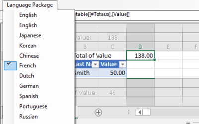 In Spread, you can use language packages to enable users to set language preferences while working with spreadsheets. This lets users localize function names and formula keywords by creating function aliases in different languages and manage worksheets without any hassle. Spread includes localization support for 18 built-in languages, including Chinese, French, German, Italian, Japanese, and Russian. Custom language packages can also be created in case a specific language is not supported. This can be done by simply creating function aliases for specific functions and then setting the custom language using the LanguagePackage property.