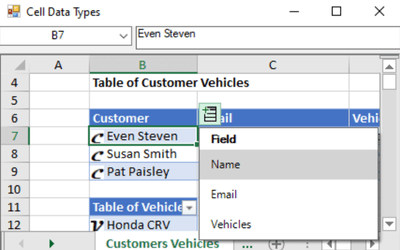 Spread.NET supports custom data types, allowing structured objects to be inserted into cells with an interactive data card popup. Users can access object properties, extract fields into adjacent cells, and expand table columns dynamically.