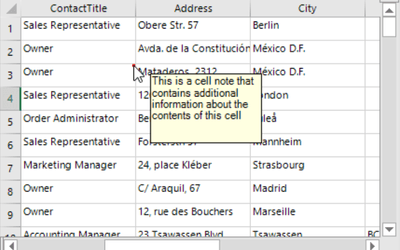 Allows .NET spreadsheet users to attach informative notes to individual cells or ranges. Comments can provide explanations, source references, or additional details about cell values. A cell note indicator, typically a small red square, appears in the upper-right corner of a cell to signify a note. Notes can be set to display on hover or remain visible as sticky notes, which can be repositioned like movable shapes. Users can also edit notes directly if enabled. Customization options include changing note indicator color, size, and positioning, as well as automatically resizing notes based on content. These notes enhance usability by providing clear, accessible annotations for spreadsheet data.